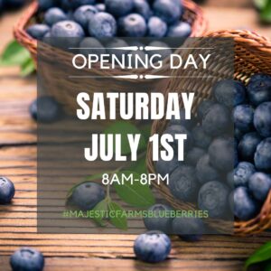 We’re getting closerJune 20, 2023Closing Early Wednesday 7/5 at 1pm!July 3, 2023 Published by admin at June 26, 2023 Categories News Updates Tags 🫐⏰ IT’S TIME TO ANNOUNCE……The juiciest and freshest blueberries at Majestic Farms on our Opening Day! You won’t want to miss this berry-licious event! Come along on Saturday, July 1 from 8 AM to 8 PM. Share2 admin Related postsAugust 10, 2025Closed for the SeasonRead moreAugust 9, 2025Last Day of the SeasonRead moreAugust 6, 2025Helping the Food BankRead more Leave a Reply Cancel replyYour email address will not be published. Required fields are marked *Comment * Name * Email * Website Save my name, email, and website in this browser for the next time I comment. Δ